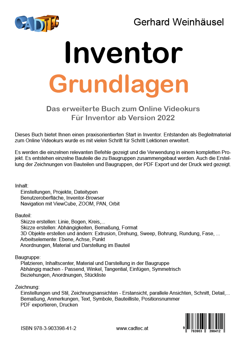 Dieses Buch bietet Ihnen einen praxisorientierten Start in Inventor. Entstanden als Begleitmaterial zum Online Videokurs wurde es mit vielen Schritt für Schritt Lektionen erweitert.