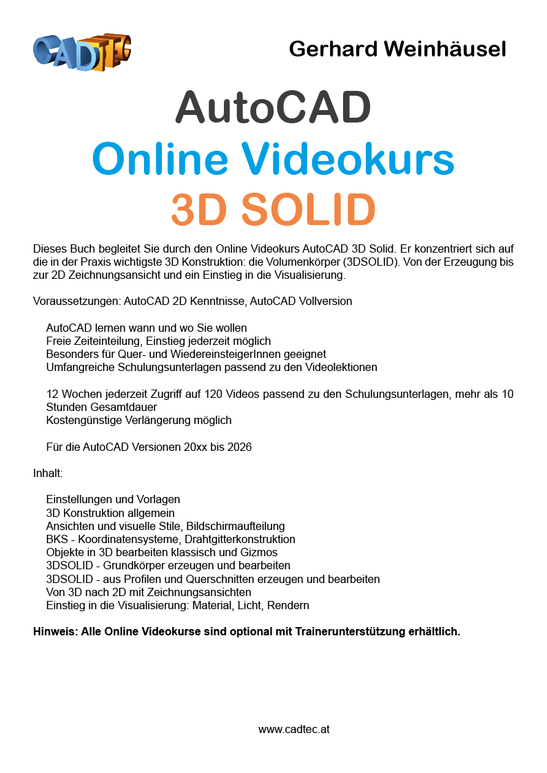 AutoCAD Anwender 3D Solid konzentriert sich auf die in der Praxis wichtigste 3D Konstruktion: die Volumenkörper (3DSOLID): von der Erzeugung bis zur 2D Zeichnungsansicht und ein Einstieg in die Visualisierung. AutoCAD 2D Kenntnisse werden vorausgesetzt.